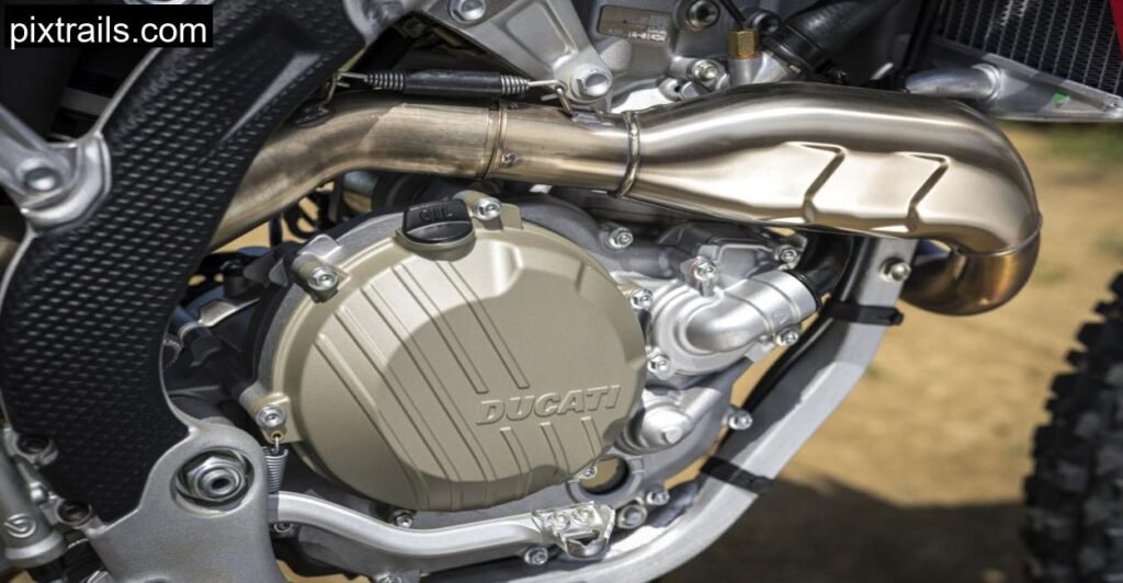 The clutch lever felt light in the hand, Brembo’s familiar precision immediately evident. I thumbed the starter and the Desmo engine barked to life. The idle was crisp, the exhaust note sharp but not obnoxious, well within MX noise regs at 109 dB, but still letting everyone within a hundred meters know something special had woken up.