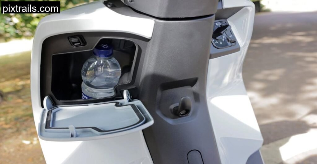 The biggest compromise with the Honda CUV e: is storage. With the batteries under the seat, there’s no helmet space, forcing you to opt for an optional 35 or 45-liter top case. For a scooter marketed as urban transport, that’s a must-have. There’s a small glovebox on the front left, enough for a water bottle and maybe your phone, and it includes a USB-C port for charging.